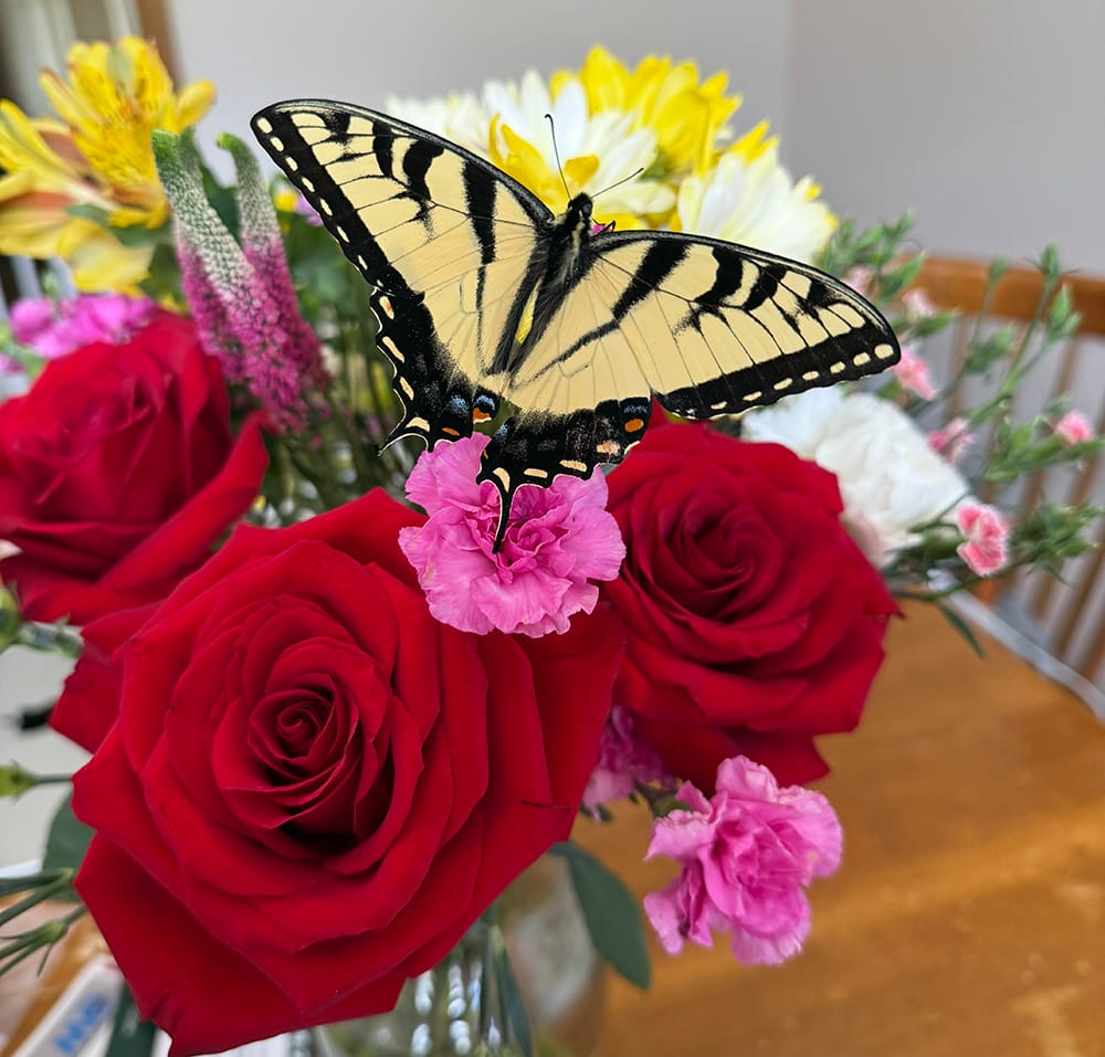 I found this newly emerged swallowtail trapped in the chicken pen. It had managed to fly in through the larger fence gaps but couldn’t figure out how to get back out through the netting overhead and was exhausted. After some sugar water and an overnight on the bouquet on the kitchen table, it flew off into sunny skies the next day.